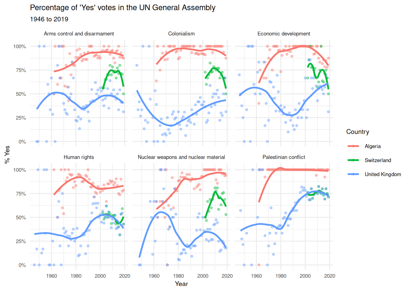 Wir wollen eine Datenvisualisierung erstellen, die zeigt, wie sich das Abstimmungsverhalten von Algerien, der Schweiz und dem Vereinigten Königreich im Laufe der Zeit bei einer Reihe von Themen verändert hat.