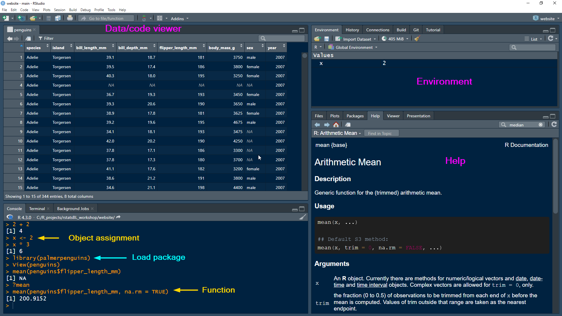 $ body_mass_g <int> 3750, 3800, 3250, NA, 3450, 3650, 3625, 4675, 3475, …