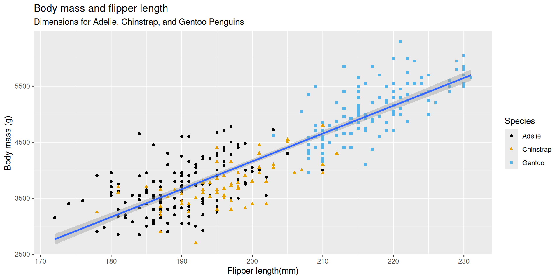 title = "Body mass and flipper length",